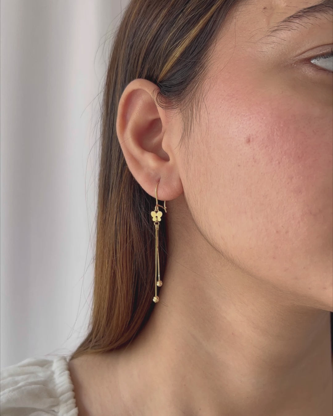 Elevate your style with our exquisite Butterfly Drop Earrings. Made with 18k sparkling gold, these earrings will add a touch of luxury to any outfit. Embrace your inner elegance with these delicate butterfly earrings.