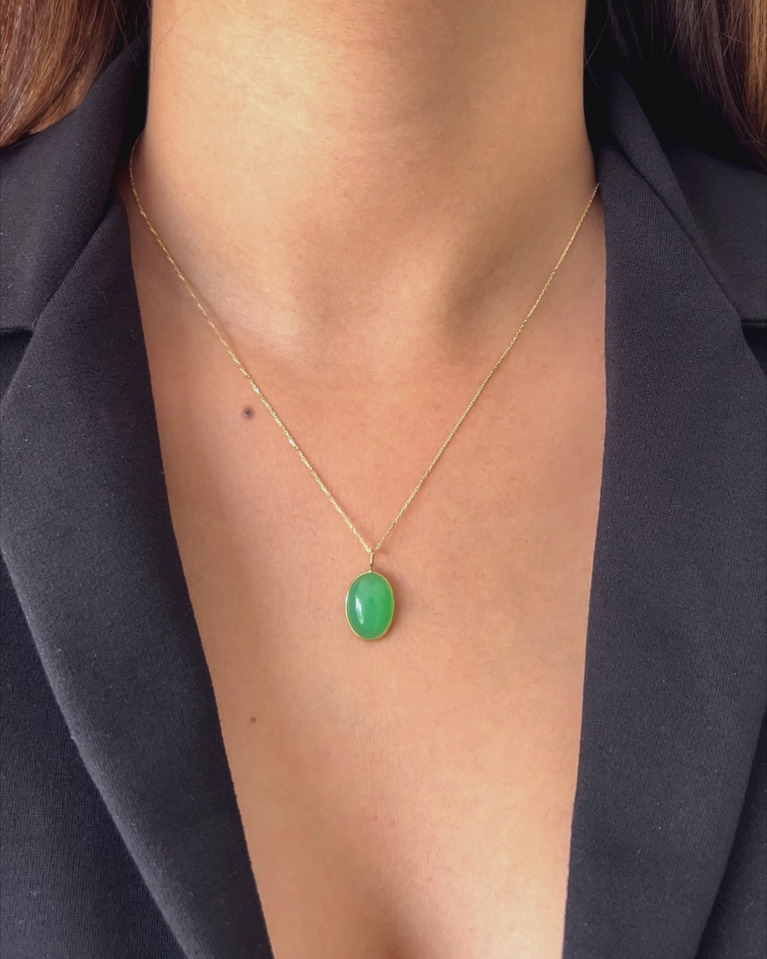Transform any outfit into a work of art with our Chrysophrase Oval Pendant. Handmade with 18k gold, this pendant exudes elegance and luxury. The smooth, oval shape of the pendant is complemented by the vibrant green hue of the chrysophrase stone, creating a truly exclusive piece. Elevate your style and make a statement with this one-of-a-kind pendant.