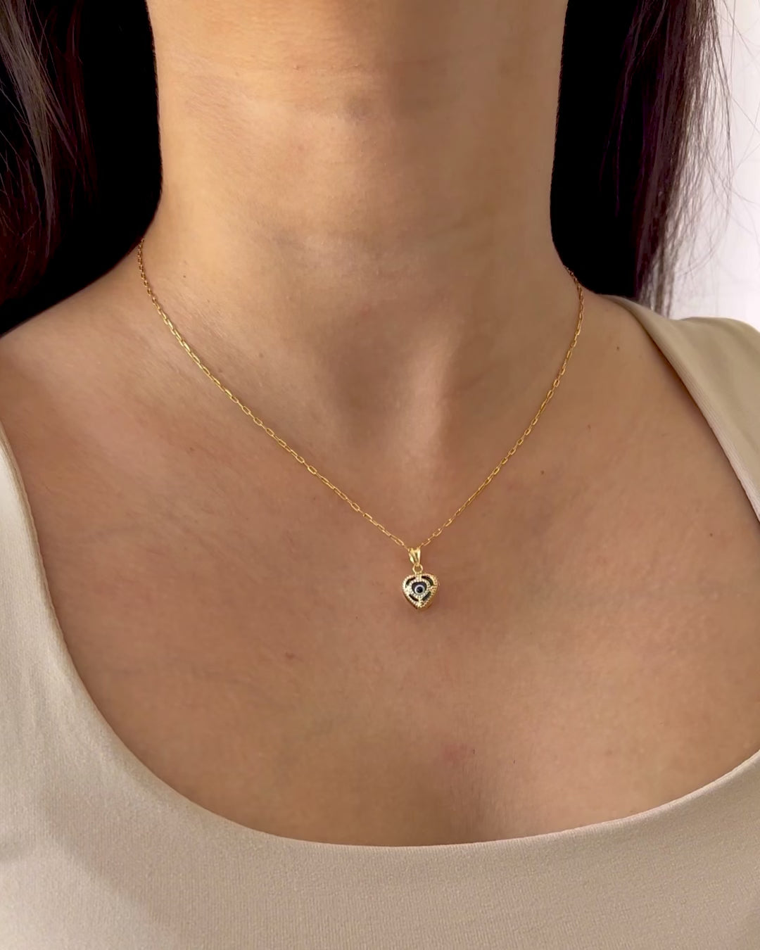 Introducing our Evil Eye Heart Pendant, a symbol of protection and love. This luxurious piece features a stunning evil eye design, crafted with intricate detail and adorned with a heart-shaped pendant. Elevate your style and ward off negative energy with this unique and exclusive accessory.