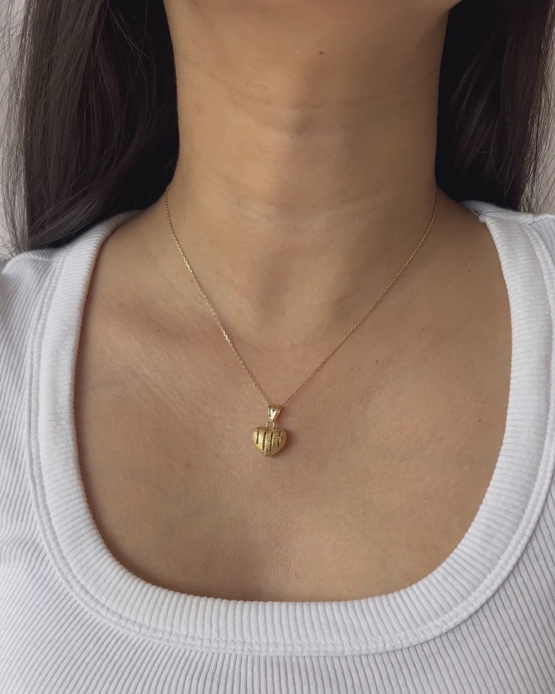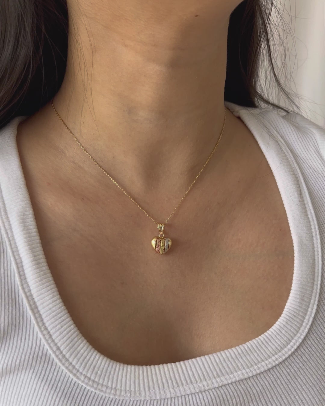 Introducing our Striped Heart Meander Pendant, crafted with 18k gold. This exquisite piece boasts a unique striped heart design, symbolizing eternal love and passion. Elevate any outfit with this luxurious accessory, perfect for those who appreciate sophisticated and exclusive jewelry.