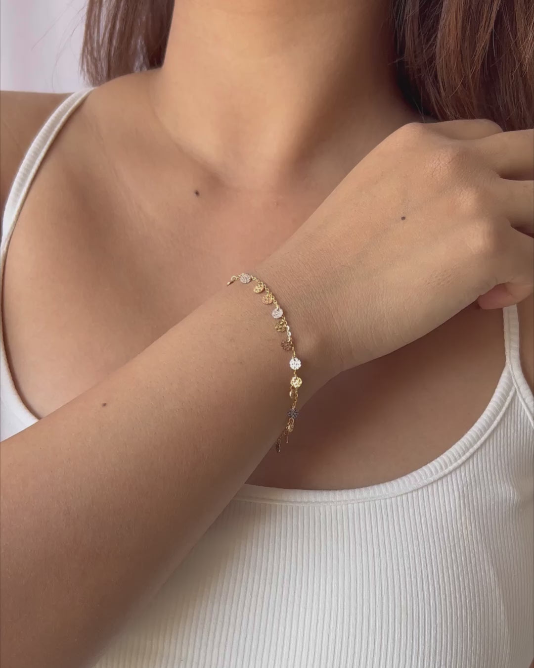 A modern classic with artisanal charm, this bracelet features hammered circle charms in a beautiful trio of white, rose, and yellow gold. The textured finish adds depth and shimmer, catching the light with every movement. Crafted in Italy from real hallmarked 18k gold, it’s a timeless piece that brings warmth, style, and versatility to your jewelry wardrobe.